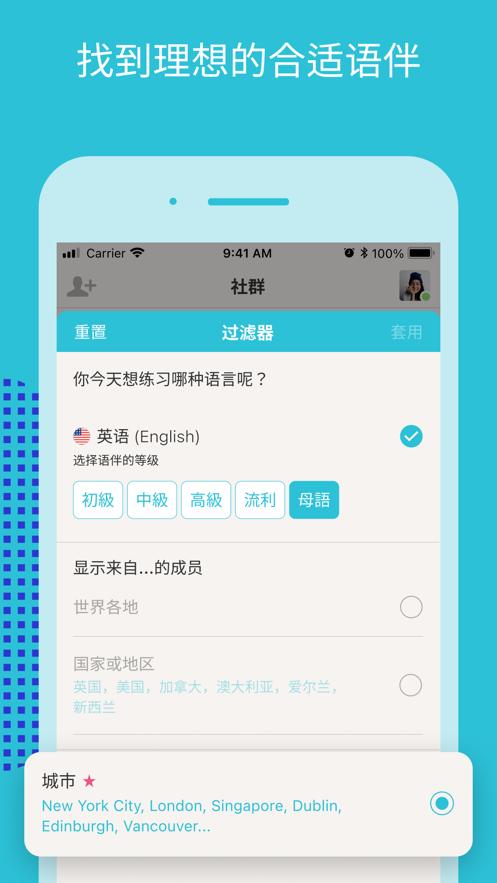1、可根据不同用户所需的语伴、话题、地点进行快速筛选匹配,找到志趣相投的伙伴,打破空间地区限制,轻轻松松在线互动学习。