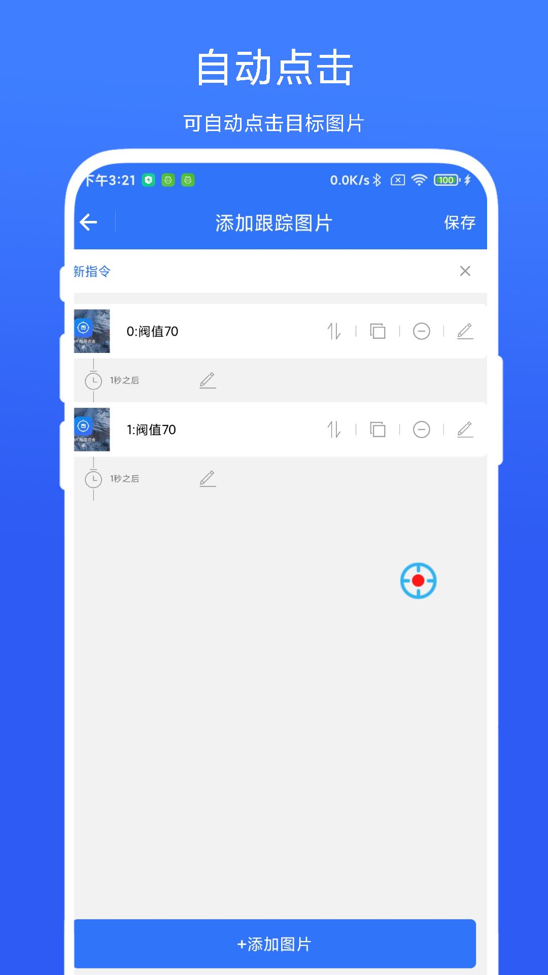 图片跟踪点击器APP,一款可以识别跟踪点击手机屏幕图片的APP。软件通过积木搭建的方式,让用户自由设置需要跟踪并点击的图片,每张图片可以设置不同的阀值,只有相似度超过阀值后才会触发点击事件。另外,软件支持对已有的动作进行再编辑和分享功能,也可以备份到手机本地。