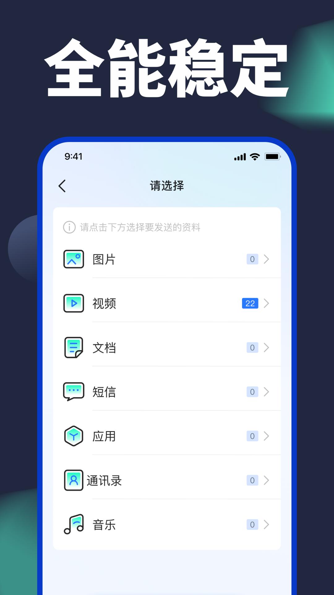 支持照片、视频、通讯录、软件、通话记录等多种数据传输;
