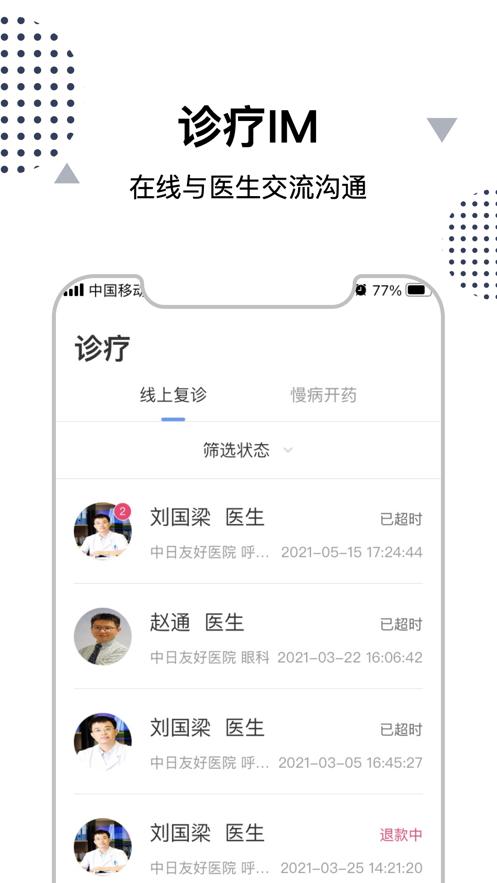 【在线复诊】足不出户,通过互联网在线复诊,医生与患者可进行图文、语音、视频实时沟通,在线问诊,极大提高就医效率;