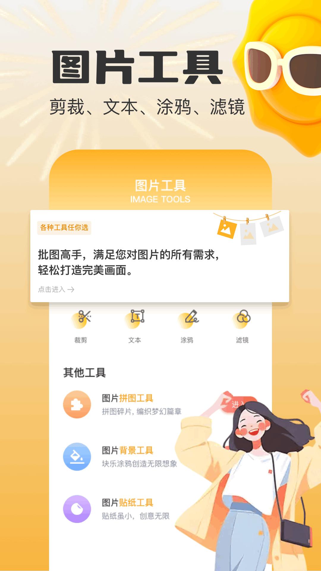 这款图片编辑软件功能全面,集修图、拍照及头像制作为一体。修图工具丰富多样,支持裁剪、文字添加、涂鸦、滤镜多种操作,轻松满足用户个性化需求。拍照功能强大,内置种效果,让每一张照片都美美哒
