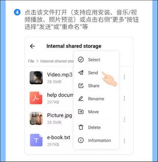 4、点击该文件打开(支持应用安装、音乐/视频播放、照片预览)或点击右侧“更多"按钮选择“发送"或“重命名"等