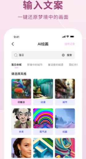 AI作画生成器,通过强大的AI智能技术,实现以文字描述生成画图的功能。只需描述您天马行空的想法,即可创作生成艺术梦境般的作品。选择一种艺术风格,一键还原梦境中的画面,在几秒钟内生成艺术画作。让您实现成为艺术家的梦想!