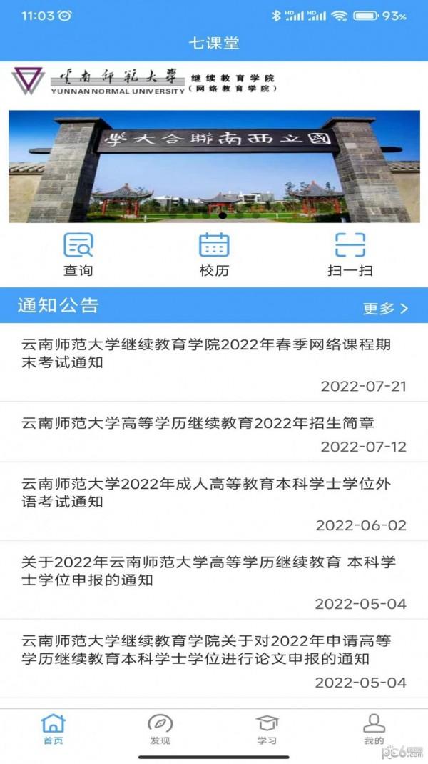 云南师范大学七课堂app是云南师范大学专门为本校的学生打造的一款综合式的学习中心,这里不仅仅可以查询学校相关的公告,还可以查询自己的考试的成绩和成人自考的录取情况,还有最新的校园校历,也是一款学生专用的学习服务平台,赶快来下载使用吧。