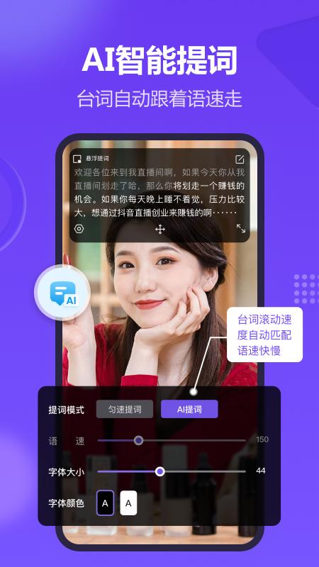 开启提词功能后,可悬浮在任何app上滚动播放,配合直播,短视频软件使用;