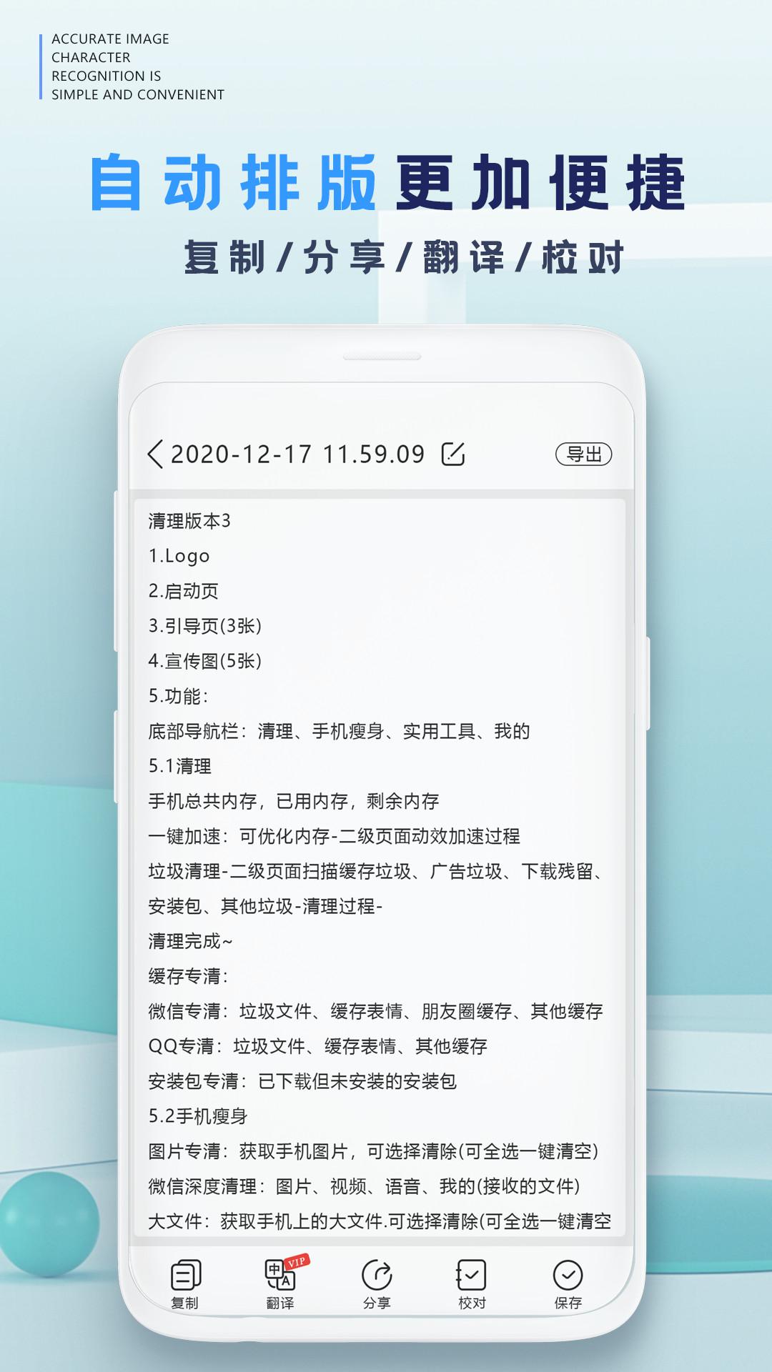 我们为您提供历史扫描保存功能,让您下次使用无需扫描,您可以通过复制、翻译、分享、校对等功能对文件进行使用,超级方便快捷!