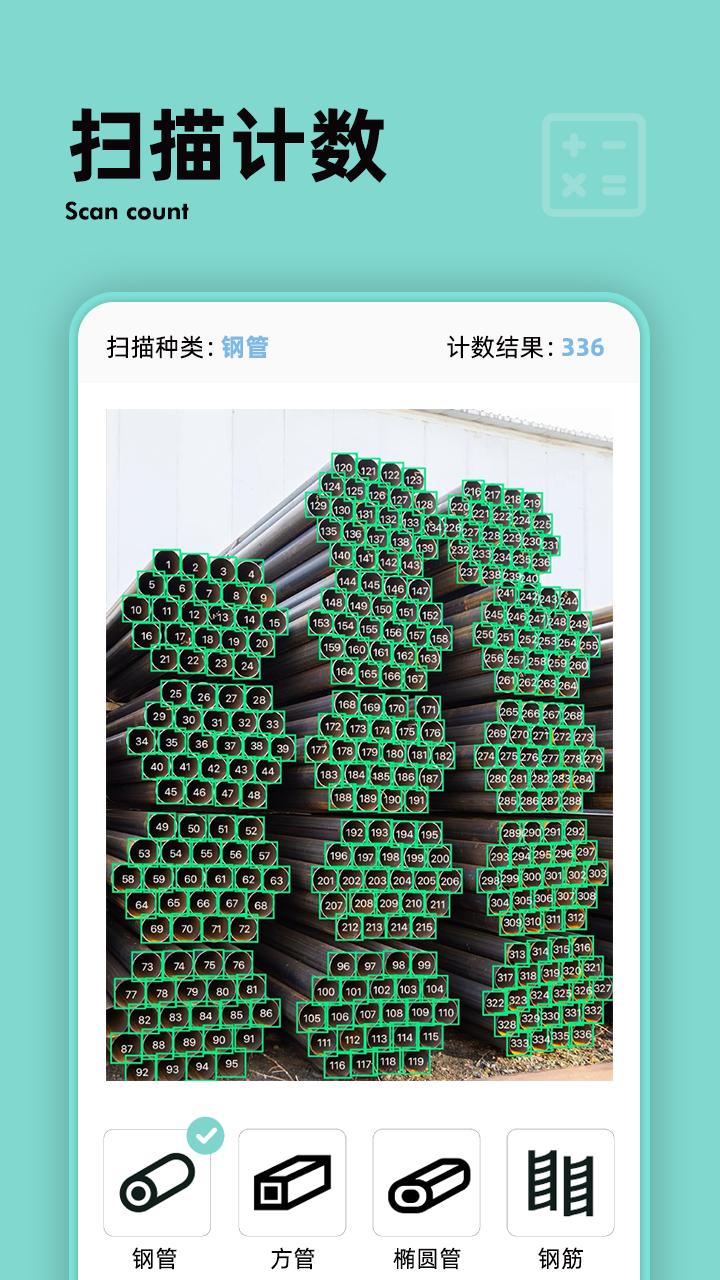 掏出手机,对着物体拍照,智能识别出物体的数量,包括但不限于钢管、方管、椭圆管等工地常见的物体。