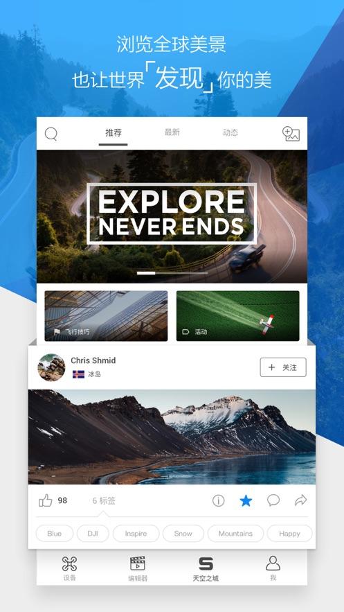 可配合DJI 飞行器实现实时图传查看,相机参数设置,以及航拍视频和图片的编辑、分享等功能。