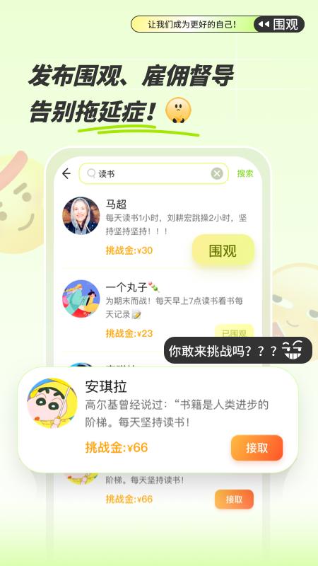 同时它也能帮你督促自我、达成目标,制定一个例如每日运动、每日读书的挑战,日复一日努力,让你变得更自律,也可以请一位用户当你的挑战督导,有人陪你一起加油前进也许会更顺利哦,快来绿提体验吧。