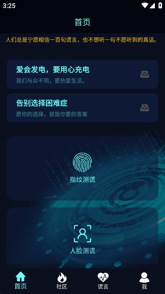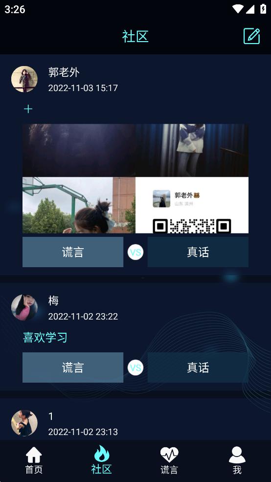 2、社区,一个真人测谎的地方,发一个主题,让大家判断是否在说谎。