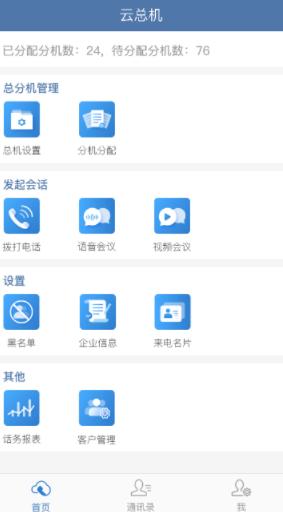 丰富的首页服务功能划分栏,这里有用于总分机管理、发起会话以及设置和其他功能栏;