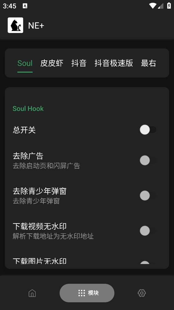 ne模块app是款功能多多且安全好用的手机模板工具抖音、soul以及皮皮虾等众多软件都可以使用,喜欢的用户可以来体验和设置,操作简单且功能多多,可以为你轻松去除各种广告问题。