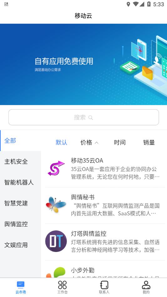 1、按管理员分配的选购应用,在移动云市场使用应用,如:可以通过即时沟通、电话等应用随时随地与企业内部员工保持沟通。