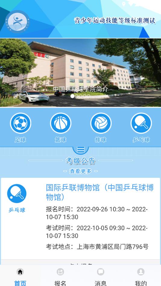 技能测试app是一款运动技能等级标准测试移动助手,软件拥有报名,消息,我的等等功能板块,可以助力更好的技能测试,需要的朋友欢迎前来下载使用。