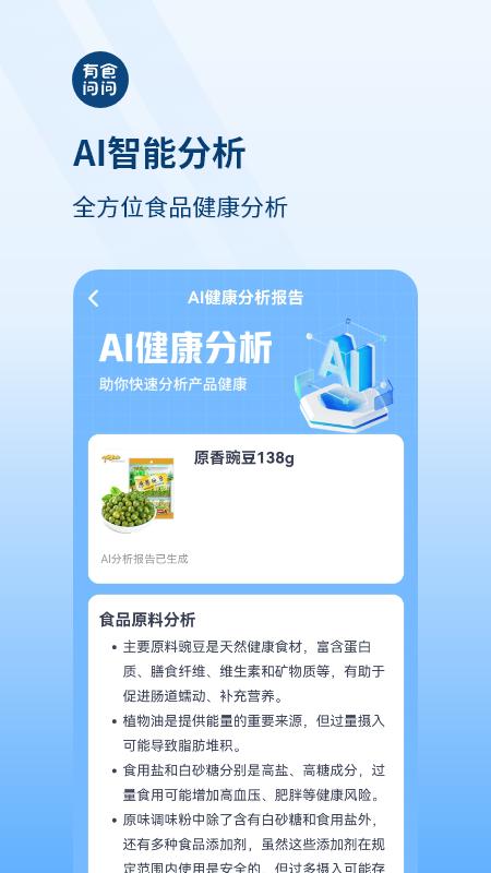 有食问问是一款专注于食品成分查询分析的科技工具,通过AI黑科技帮助用户快速识别食品中的添加剂、营养成分、致敏原等成分,让普通消费者也能轻松掌握食品“透明权”。