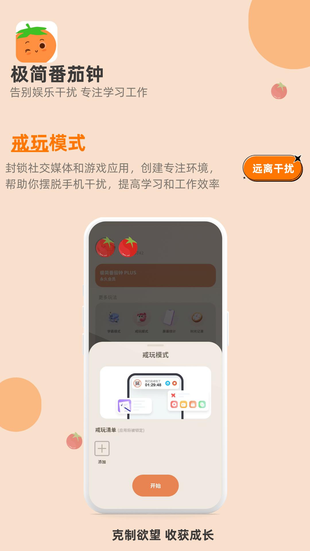 一款基于番茄工作法的极简专业App,帮你提升效率、培养自律、战胜拖延,并通过戒玩模式+学霸模式彻底锁住专注力。
