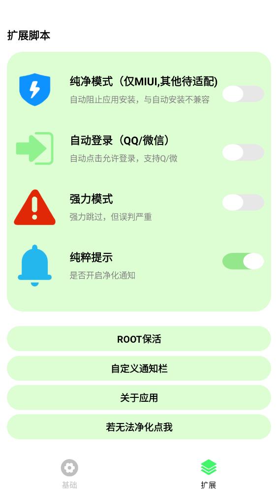 有跳过启动页广告,自动原图,自动安装,自动登录,纯净模式。