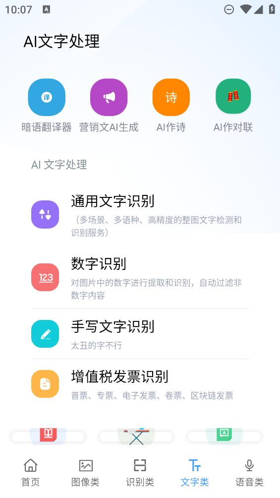 1、文字类:有暗语翻译、营销文AI生成、AI作诗、AI对联、通用文字识别、手写文字识别、发票识别等等,看不懂别人写的字,直接识别;什么藏头诗、营销小作文一键生成。