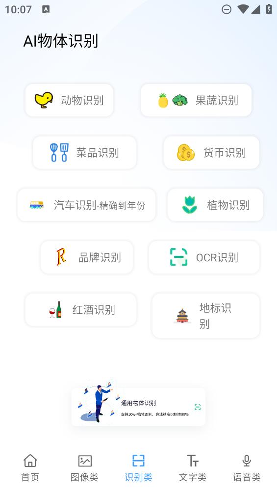 4、识别类:可以识别动物、果蔬、菜品、货币、汽车、植物、品牌,还有个通用物体识别工具,支持10万加的物体识别,还能识别OCR,提取文字等。