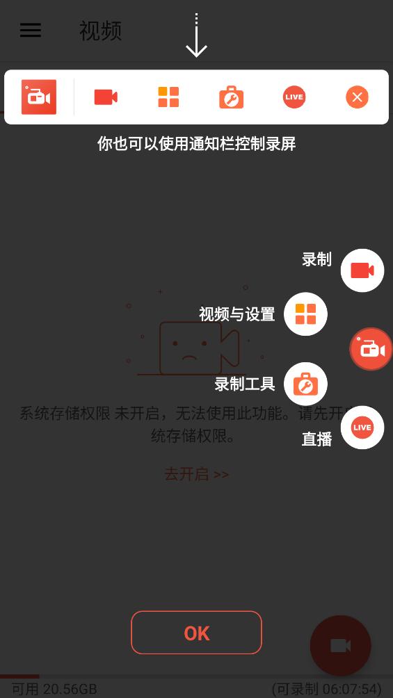 通知栏下拉式菜单一键单击启动、停止录制/录制时摇一摇手机停止录影
