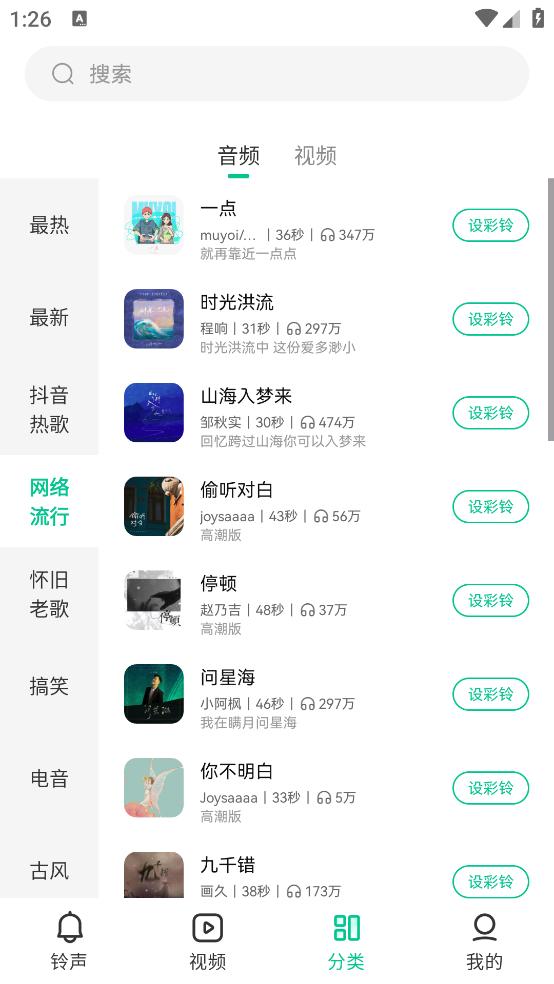 2、铃声搜索:提供了方便快捷的铃声搜索功能,通过关键词搜索自己喜欢的铃声,节省时间,快速找到心仪的铃声。