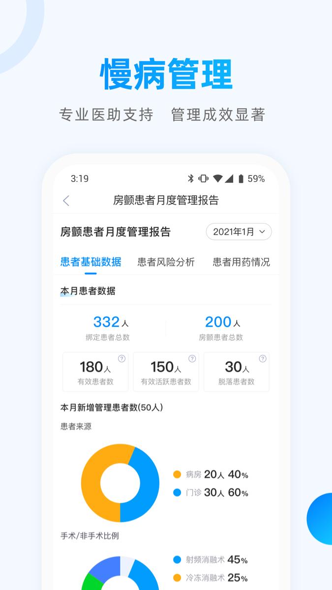 患者管理:收集完整诊疗资料、可视化患者分析、智能化随访管理、自动化随访提醒、多样化随访方式,为医生提供直观实用的患者管理方案。