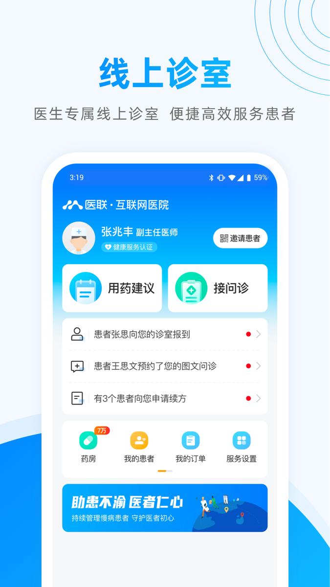 3、执业:多点执业,患者管理,在线问诊,医联为您提供一家专属的线上私人医院,助您塑造医生个人品牌,触达更多患者,是您职业成长的*佳渠道。
