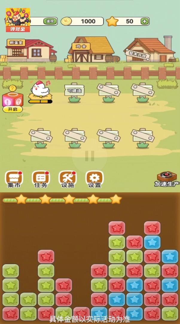 这个养鸡小游戏结合消除和养成玩法,通过消除来获得更多的小鸡,感受全新的种植游戏带来的体验不断提升自己农场的等级,游戏操作起来没有太多的难度,而且还能获得现金红包奖励呢。