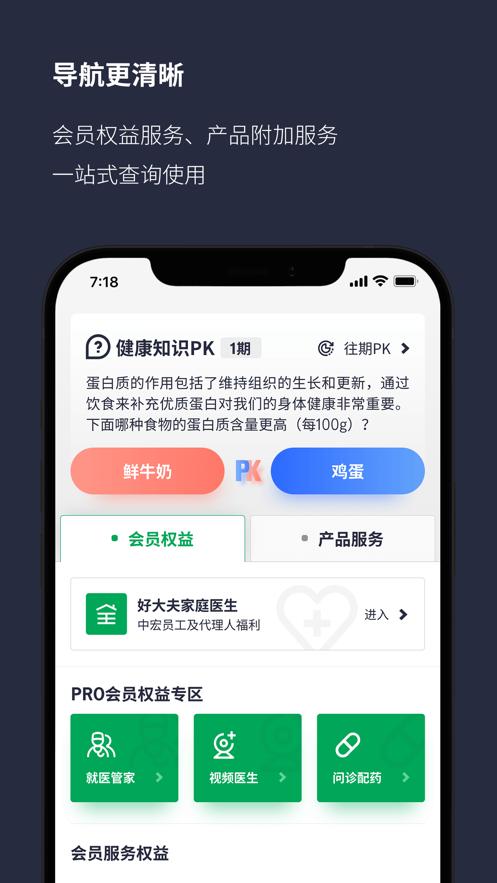 2、 【健康】页面:导航更清晰,会员权益服务、产品附加服务,一站式查询使用;