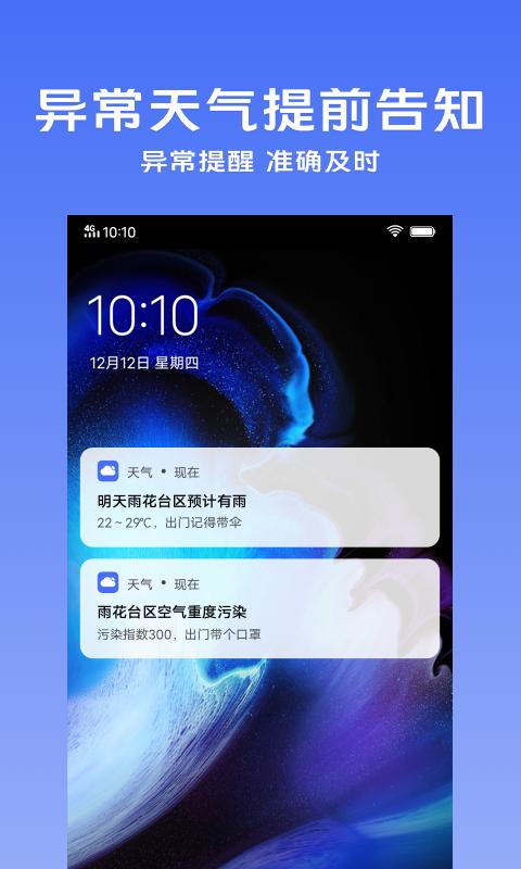 特殊天气提前发送预警信息,帮助用户更好制定生活计划,从容应对各类天气状况。
