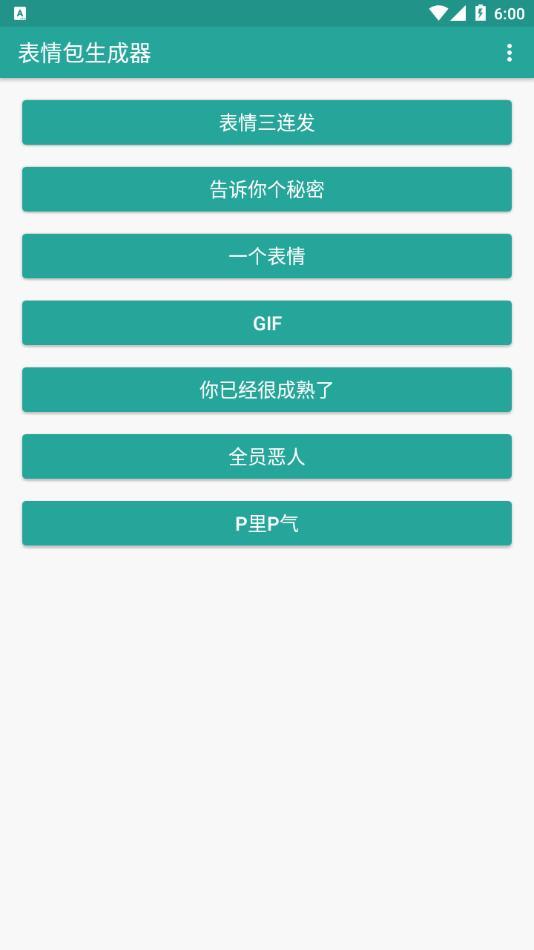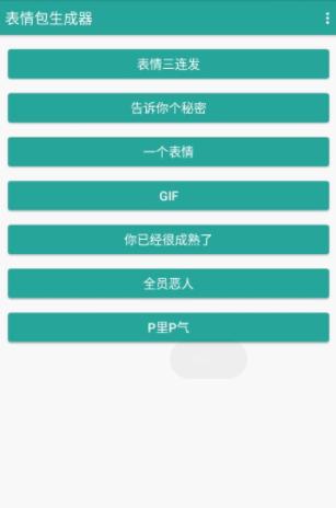 这款软件一打开就能看见有7个功能选项!表情三连发、告诉你个秘密、一个表情、GIF、你已经很成熟了、全员恶人、P里P气!无付费全部免费操作!里面拥有好多个不同的表情包类型,蘑菇头、猥琐萌、小坏坏、小仓鼠等等每个不同的表情包类型都提供了丰富的素材!