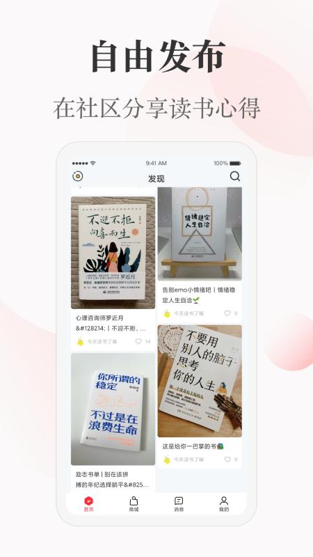 【社区分享】用户可自由在社区发布自己喜欢的图书和读书视频,分享自己的读书心得及好书推荐,并与他人讨论,让所有用户都可以购买到自己喜欢的图书。