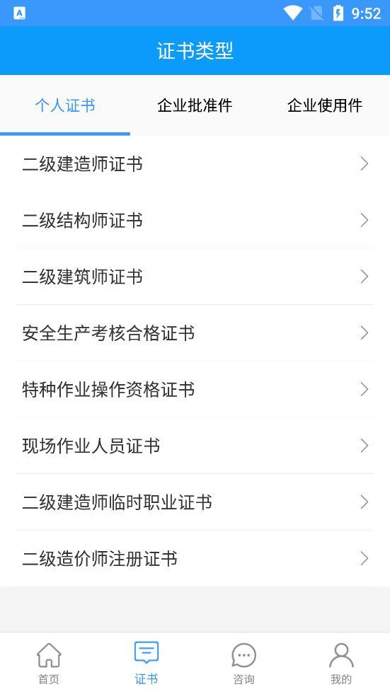 陕西住建执业证书app是个人和企业电子证书查看软件,用户可以直接在上面查看自己的个人证书,还可以看到很多的政策法规消息,有什么问题也可以直接在线询问客服,使用起来十分的便捷,有需要的用户快来下载使用吧。