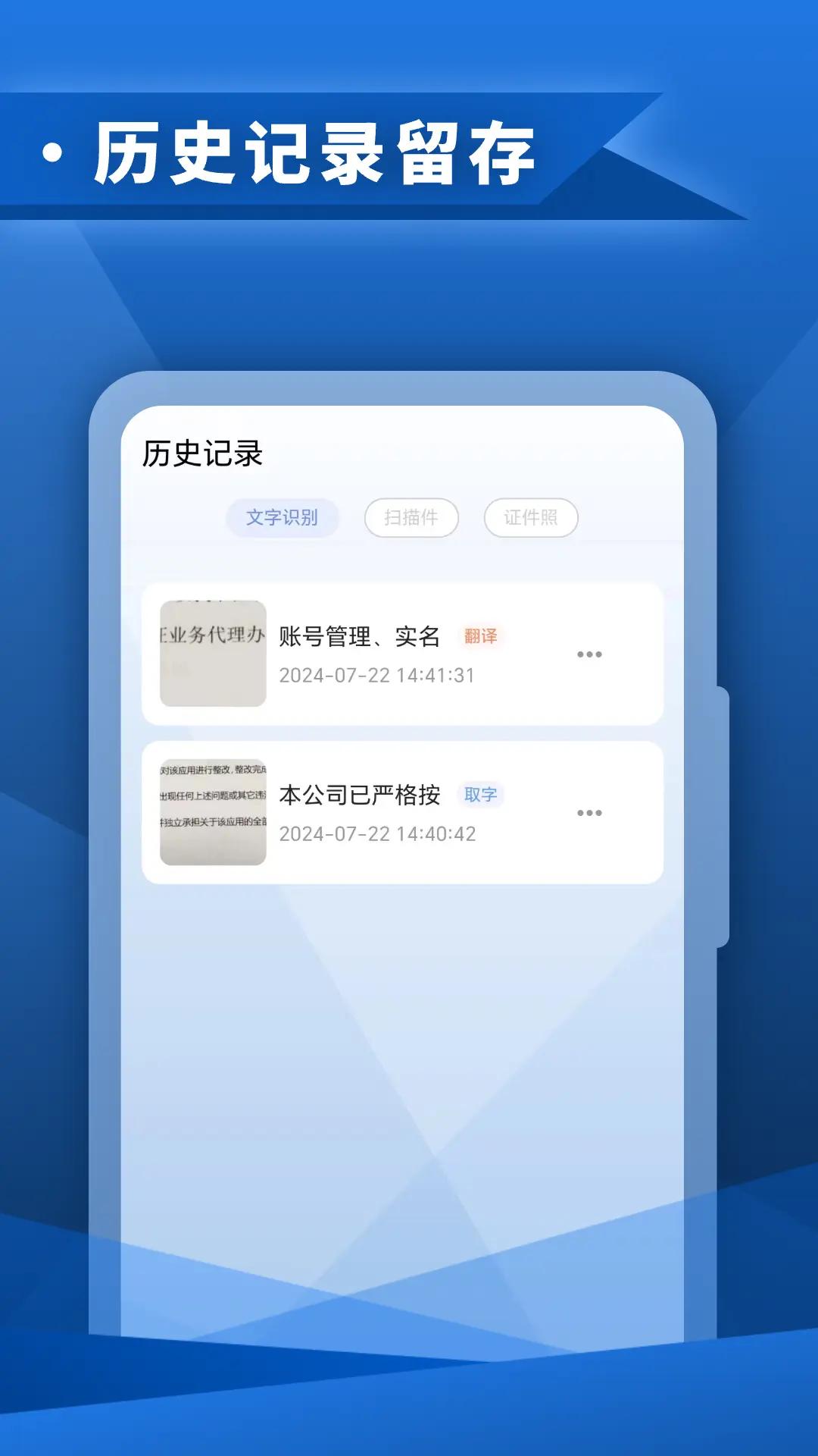 文字、扫描件、证件照等自动保存历史记录、智能分类,检索方便。