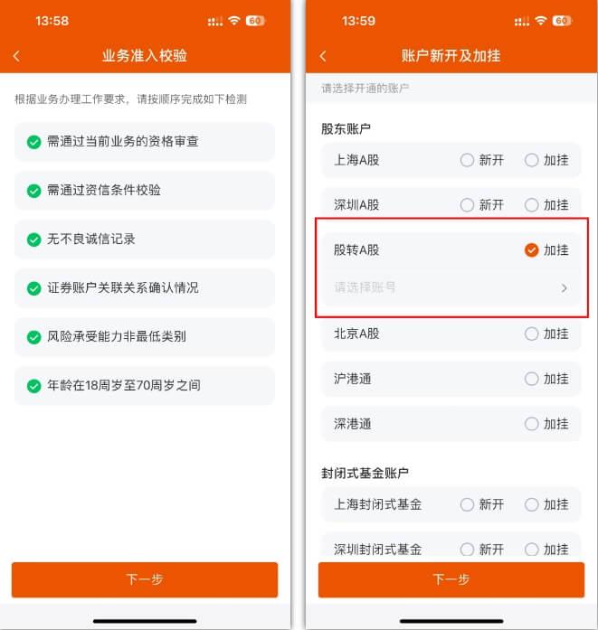 2. 通过业务准入校验后,选择“股转A股”,选择账户,通过适当性匹配后,即可进行业务开通。