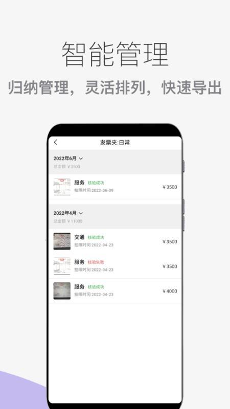 【识别发票】一键上传发票,告别传统手录,利用人工智能技术,识别准确率高达95%,轻松记录。