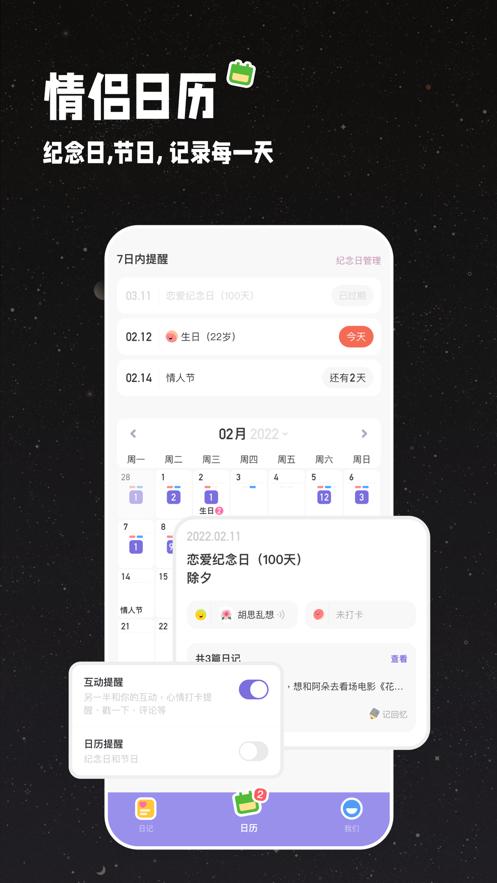 情侣星球应用,提供恋爱记录、共享日记、情侣相册、纪念日、桌面插件等甜蜜恋爱专属应用,邀请情侣共同在情侣星球中遨游,享受元宇宙中的甜蜜恋爱。