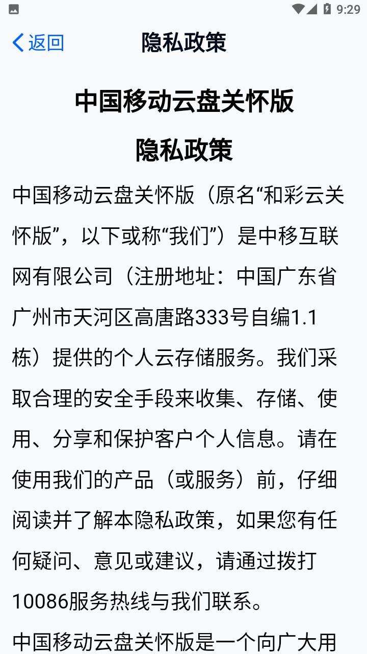 中国移动云盘关怀版(原名“和彩云网盘关怀版”)是中国移动重磅推出的安全+智能+不限速+移动用户免流的网盘,通过对网盘功能的简化,助力更多的老年人跨越数字化的鸿沟,为提高老年人的生活质量尽一份力。