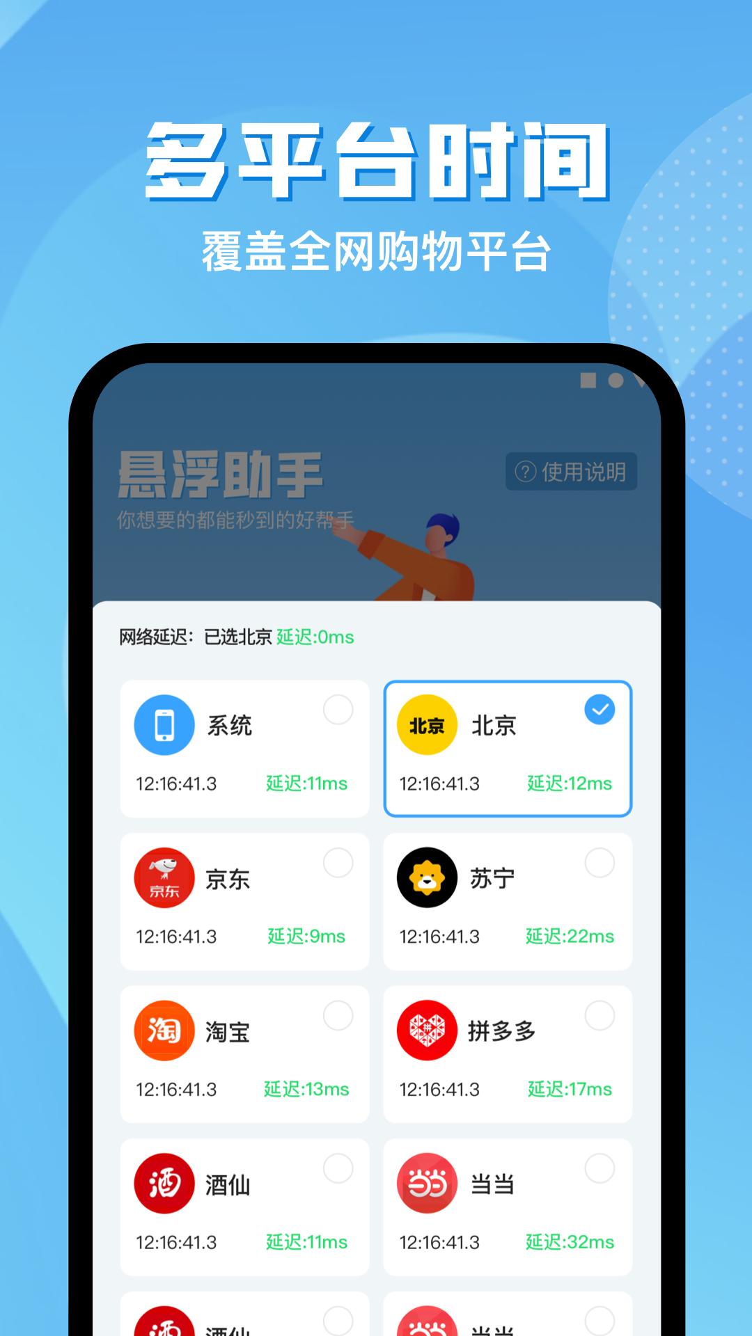毫秒倒计时的抢购助手,支持京东/淘宝/拼多多多点等超多渠道校准,让你的整点抢购更精准!