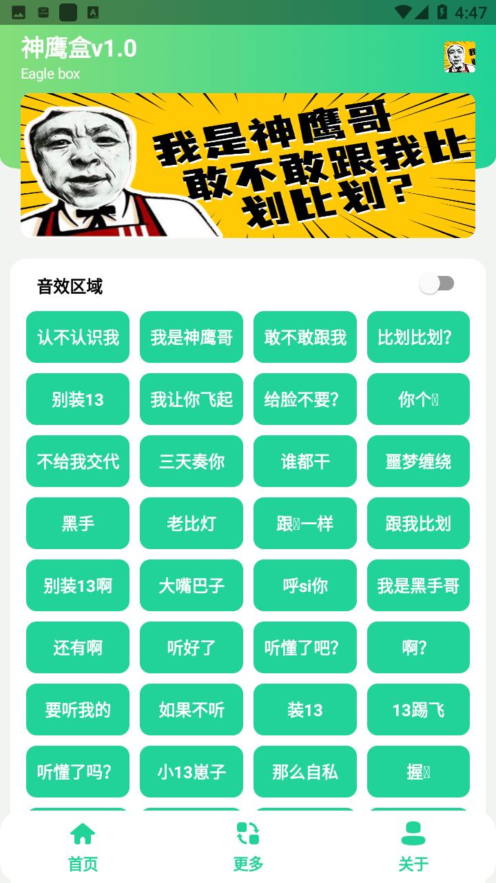 神鹰盒语音包是一款当下十分火热的网络趣味语音包,内容都是非常的齐全,各种音效工具都可以让用户快速搜索,让你体验变声的快乐,感兴趣的朋友可以来下载体验一下。