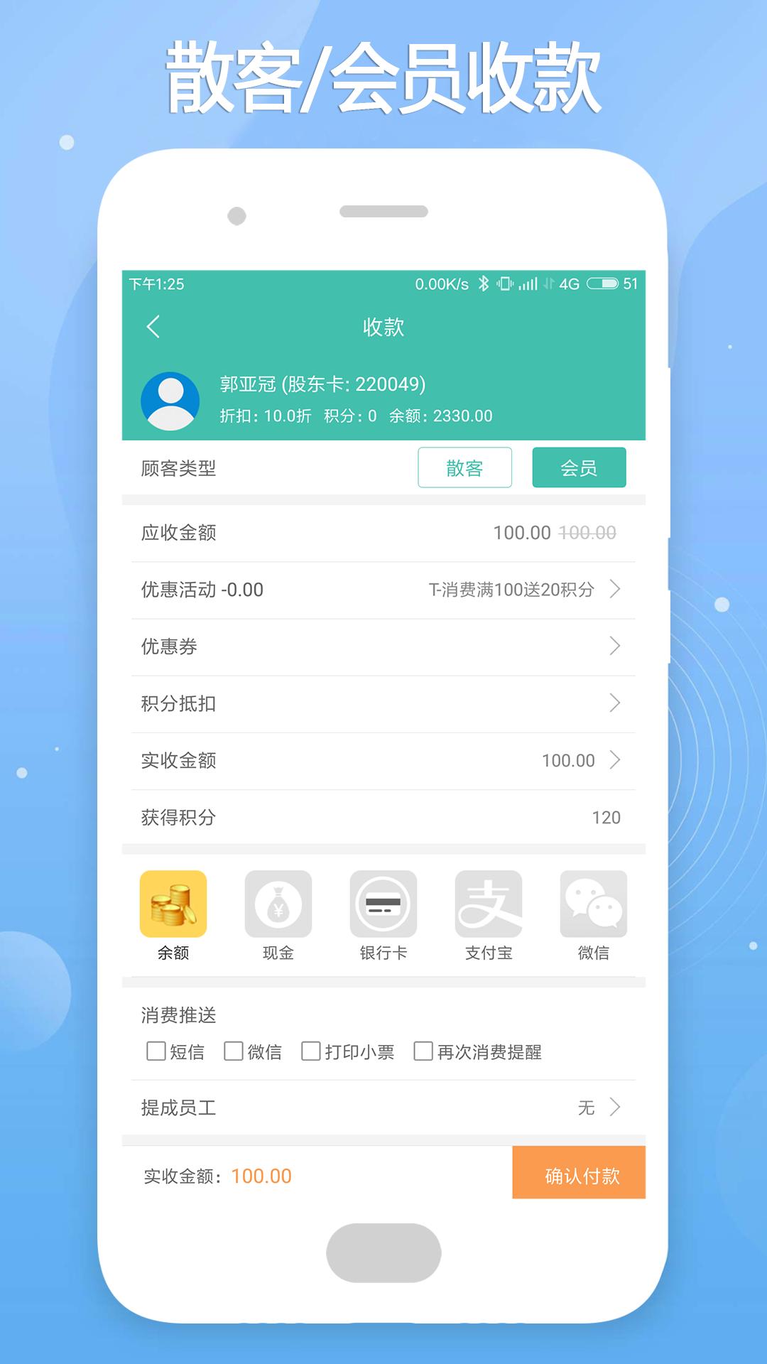 快速结账:快速结账、多种收款方式、优惠活动、积分折扣。