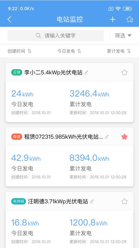 用户可远程实时监控电站发电数据,查看电站健康度,理论发电量对比和历史数据查询,附近电站功率对比,电站设备管理;自动识别发电异常电站!