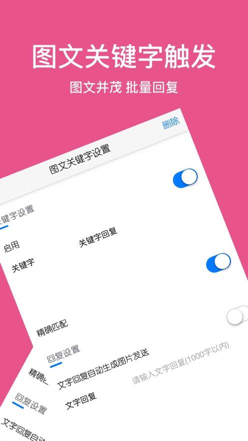 自定义设置关键词及回复内容(支持文字+图片),一旦群中消息中包含预设的关键词,机器人便会自动回复关键词对应的内容。