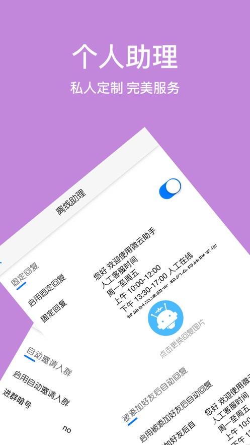 微云助手是国内顶尖的微群管理软件,作为实用的微群助手,帮助管理员完成微群用户数据统计、群消息自动回复、聊天机器人互动聊天、批量管理群成员、批量踢人等操作,全面快捷地解决微群管理难、信息杂、时间跨度长的痛点,提升社群活跃度及效率,帮助用户创造价值。