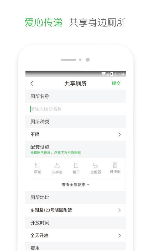 无论您是在逛街、旅游、乘坐地铁当中,遇到如厕难的困境时,通过这款APP,您可以一秒找到身边最近的卫生间,每一个卫生间的坑位、设施、环 境等,都直观的展示出来。如果您是爱心人士,要贡献爱心,在经过平台认证之后,您就可以开放自己企业、商铺的卫生间,虽然雷锋做好事从来不留名,但是我们需要更多像您一样的爱心人士来照亮我们的城市,来提升城市的文明程度。
