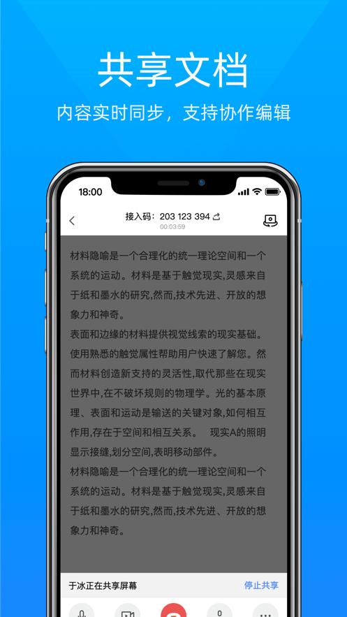 【文档共享】会议内支持共享播放文档,参会人自动和演示者同步。参会人可以向文档所有者申请编辑权限,获得权限后,参会人可以协作编辑文档,提高沟通效率。