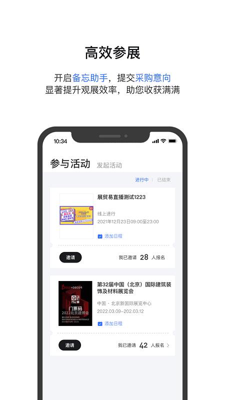 展贸易APP是为中小企业打造的“一站式”、整合型数字社区营销运营平台,集合行业活动资讯,活动组织及管理,便捷备注、商贸配对及意向提交等功能模块,帮助企业与客户建立起更紧密的联系,助力行业人士开发并维护行业人脉网。展贸易,拓展贸易更容易。