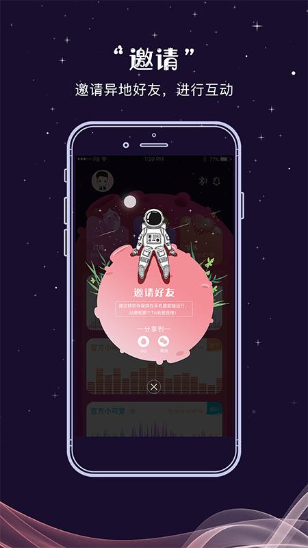 打破空间/一起嗨:为了远方的TA,打破空间的束缚,让距离禁锢于指尖;通过邀请链接,感受彼此的心跳,将这份愉悦体验的掌控权跨越空间的阻碍,交付于心中的那个让自己心动的TA。