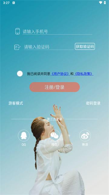 打开软件就是登录界面,可以输入手机号用验证码登录,也可以使用QQ,微信,微博登录