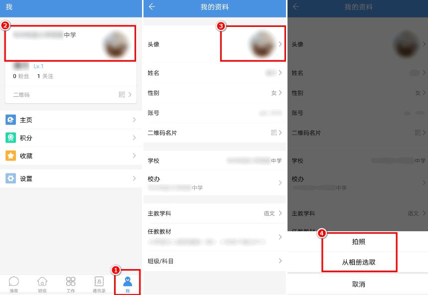 登录移动端APP,点击右下方“我”进入我的资料页面, 点击“头像”两个字, 选择“拍照”或“从相册中选取”照片上传即可。